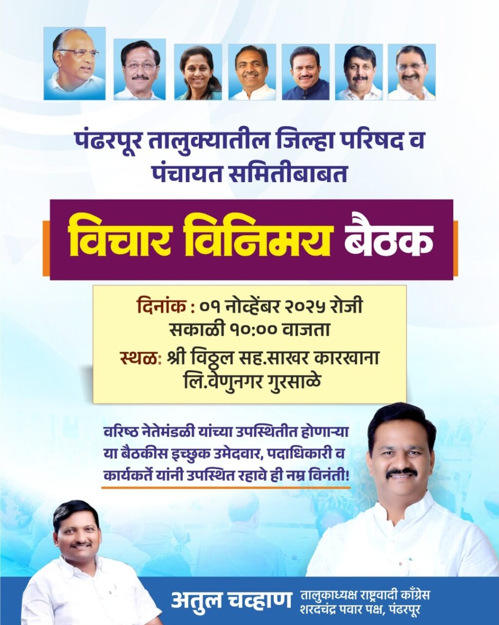 राष्ट्रवादी शरदचंद्रजी पवार गटाचे आ. अभिजीत पाटील यांनी या निवडणुकांबाबत मायक्रो प्लॅनिंग करण्यास सुरुवात केली असून ज्येष्ठ नेते मंडळी, कार्यकर्ते,महिला पदाधिकारी, पक्षाचे पदाधिकारी तरुण सहकारी व इच्छुक उमेदवारांची विचार विनिमय बैठक विठ्ठल कारखान्यावर आयोजित केली आहे.